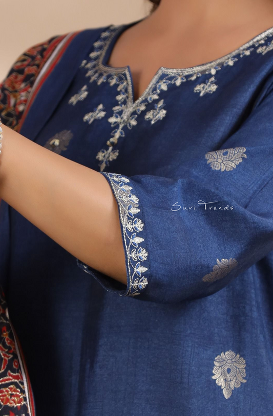 Roman Silk Suit Set with Embellished Neckline - Navy Blue