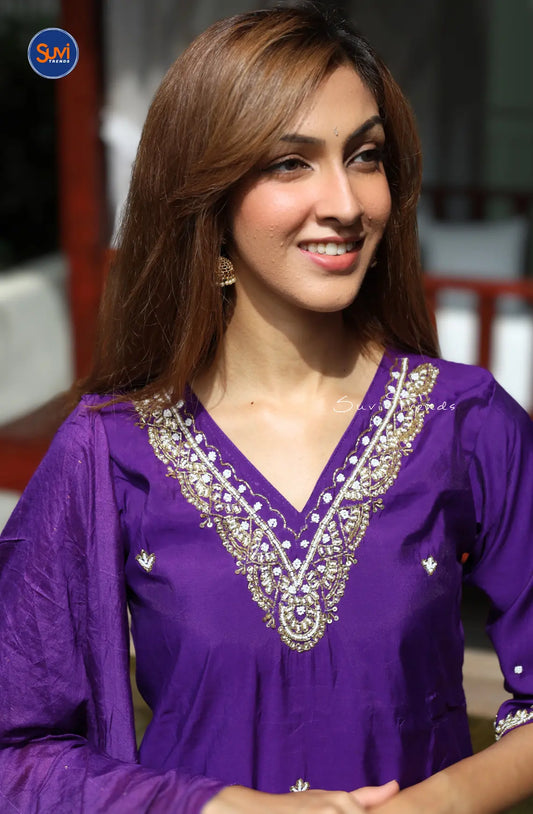 Thread Embroidery Suit Set with Organza Dupatta - Lavender