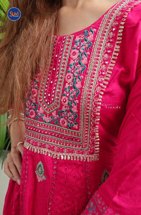 Heavy Embroidered Anarkali with Mirror Work - Rani Pink