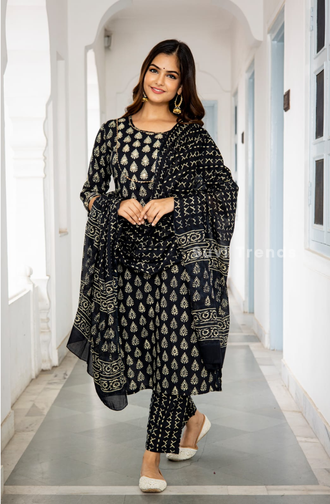 This cotton printed suit set in black brings together style and comfort with its 3 piece set, consisting of a top, bottom, and dupatta. The round neck and 3/4 sleeves add a touch of elegance, making it perfect for casual wear. At an affordable price, it's a must-have for your wardrobe. Buy online now from Malaysia.
