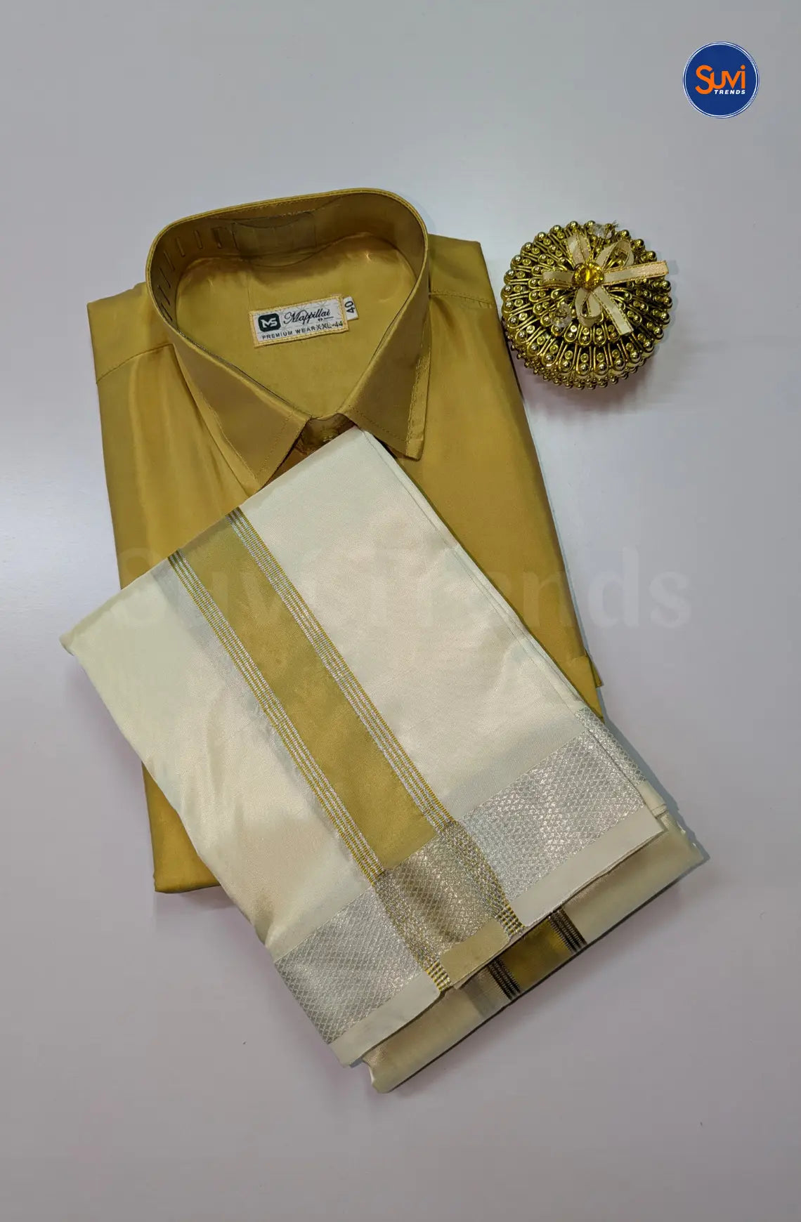This premium Kids Dhoti Set features a half-sleeve shirt and dhoti crafted from luxurious Japan Silk in a jari gold hue. Designed with convenient velcro closures, it ensures easy wear for children. Available with elegant gold, silver, or colorful zari accents, this set is ideal for special and festive occasions. Offered in bulk for Malaysia customers, it combines traditional style with premium quality for a distinguished look.