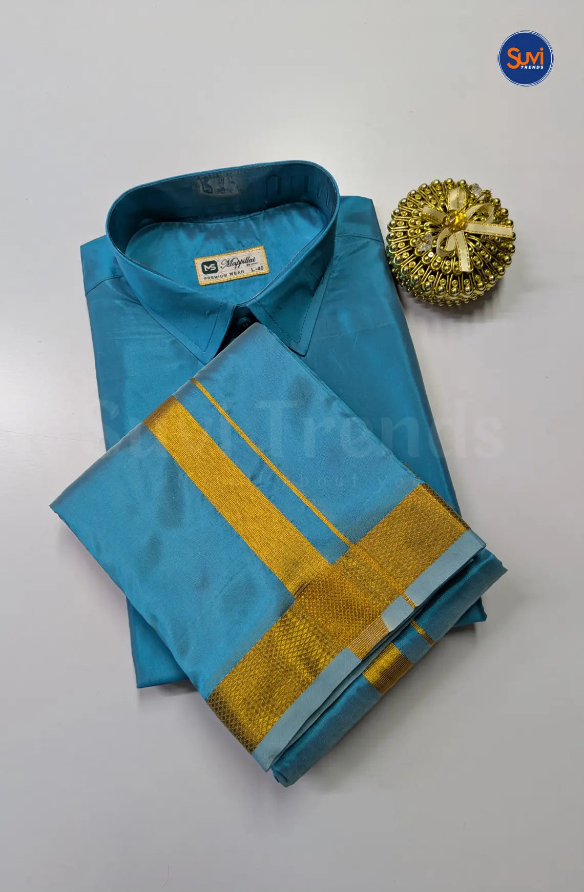 Elevate your child's festive wardrobe with this premium Kids Dhoti Set crafted from luxurious Japan Silk in a sophisticated aqua blue shade. The set includes a half-sleeve shirt and a dhoti featuring convenient velcro closures for easy wear. Highlighted by elegant gold zari detailing, this ensemble is perfect for special occasions and traditional celebrations. Available in bulk for events or retailers, it combines comfort with refined style, making it an excellent choice for your little one’s festive attire in Malaysia. Order now to ensure a distinguished look for your child.