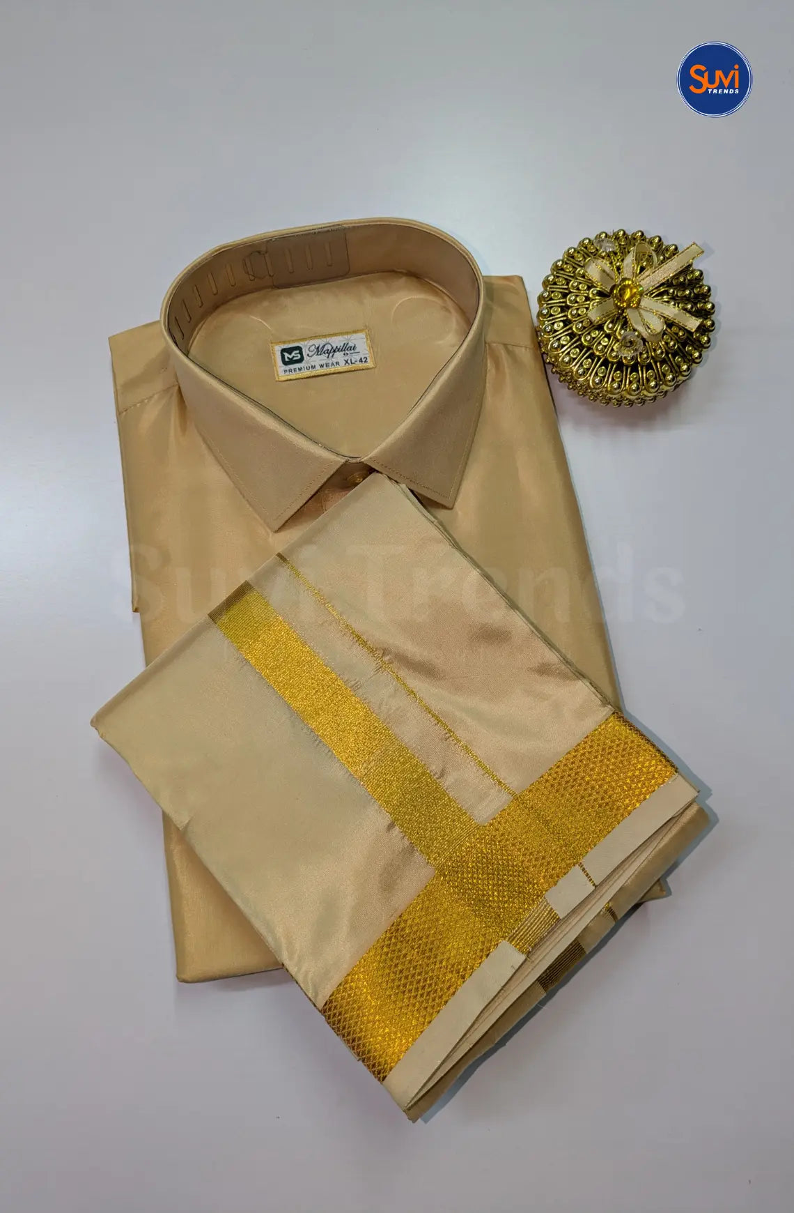 Elevate your child's festive wardrobe with this premium Kids Dhoti Set crafted from luxurious Japan Silk in a sophisticated natural sandal shade. The set includes a half-sleeve shirt and a dhoti featuring convenient velcro closures for easy wear. Highlighted by elegant gold zari detailing, this ensemble is perfect for special occasions and traditional celebrations. Available in bulk for events or retailers, it combines comfort with refined style, making it an excellent choice for your little one’s festive attire in Malaysia. Order now to ensure a distinguished look for your child.