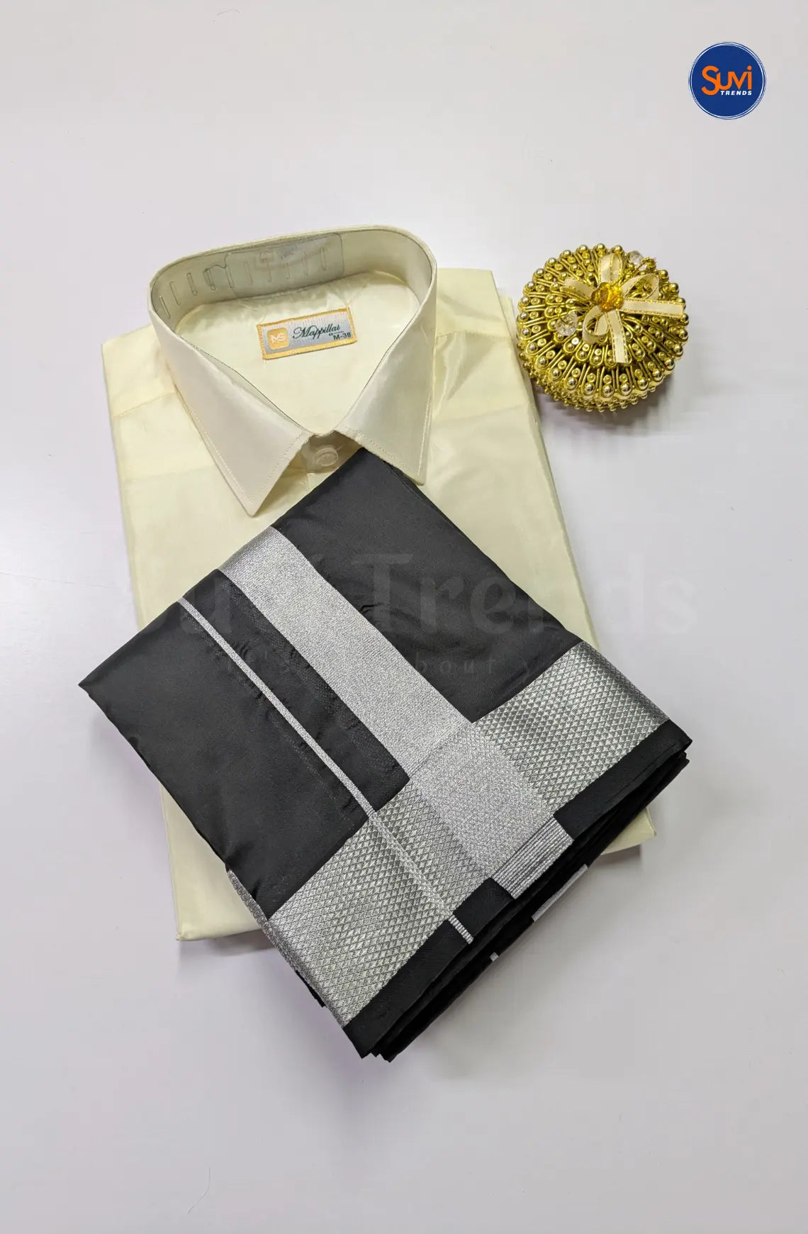 This premium Kids Dhoti Set features a half-sleeve shirt and dhoti crafted from luxurious Japan Silk in white and black hue. Designed with convenient velcro closures, it ensures easy wear for children. Available with elegant gold, silver, or colorful zari accents, this set is ideal for special and festive occasions. Offered in bulk for Malaysia customers, it combines traditional style with premium quality for a distinguished look.