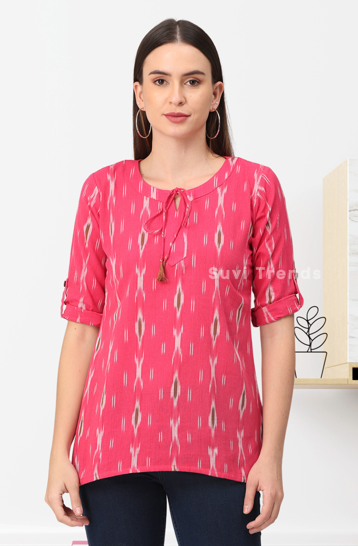 As a short kurti, the Pink Ikat Legacy Top offers a versatile and comfortable fit. Made with high-quality cotton material and featuring a unique tie-knot neck and roll-up sleeves, this top is perfect for both office and casual wear. Don't miss out on the best price by buying online from Malaysia.