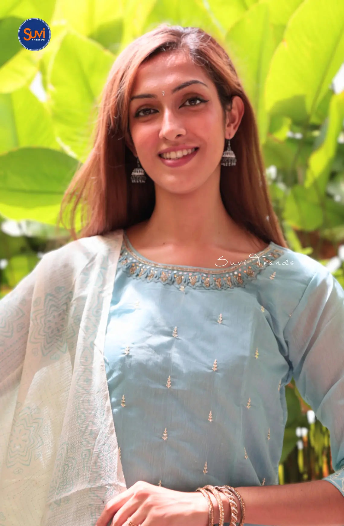 The Premium Cotton Suit Set in Sky Blue features a 3-piece set of dupatta, pant, and suit. Made with premium cotton, the straight cut set is perfect for special occasions. Its round neck is embellished with Butta work, adding an ethnic touch. Available to buy online for women in Malaysia.