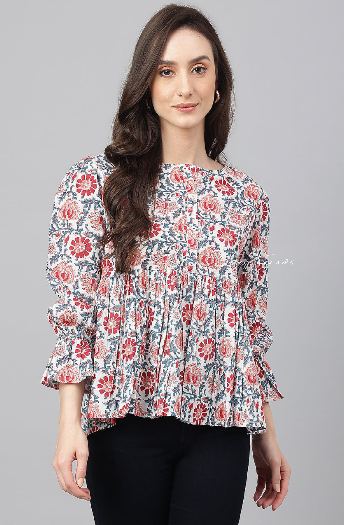 Expertly designed for comfort and style, this pure cotton flared top in white is the perfect addition to any wardrobe. With a round neck, full sleeves, and beautiful floral print, it's a must-have for any fashion-forward woman. Get the best price and buy now in Malaysia for a look that's both chic and affordable.